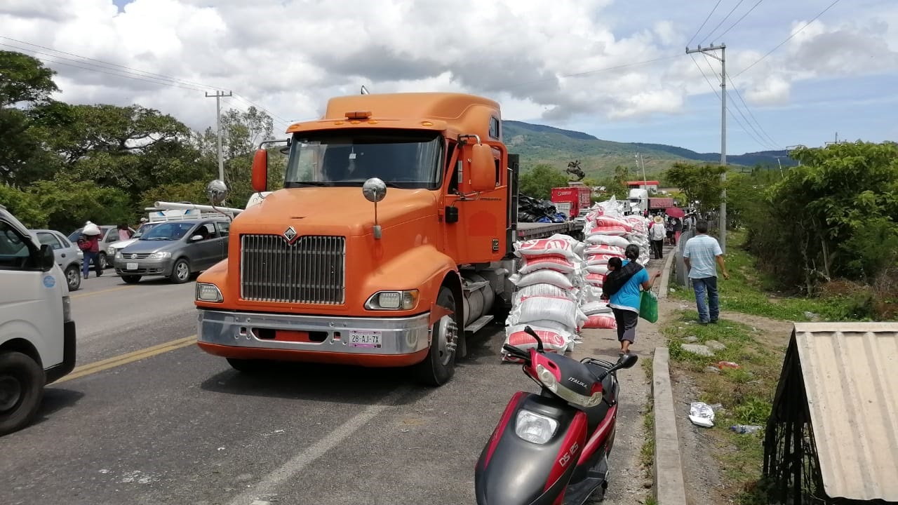 Alrededor de las 12:00 del mediodía, un trailer cargado con 30 toneladas se quedó varado en el bloqueo, el cual fue retenido de inmediato por los pobladores inconformes que ya llevaban cuatro horas plantados sobre la carretera y sin dudarlo bajaron el insumo.