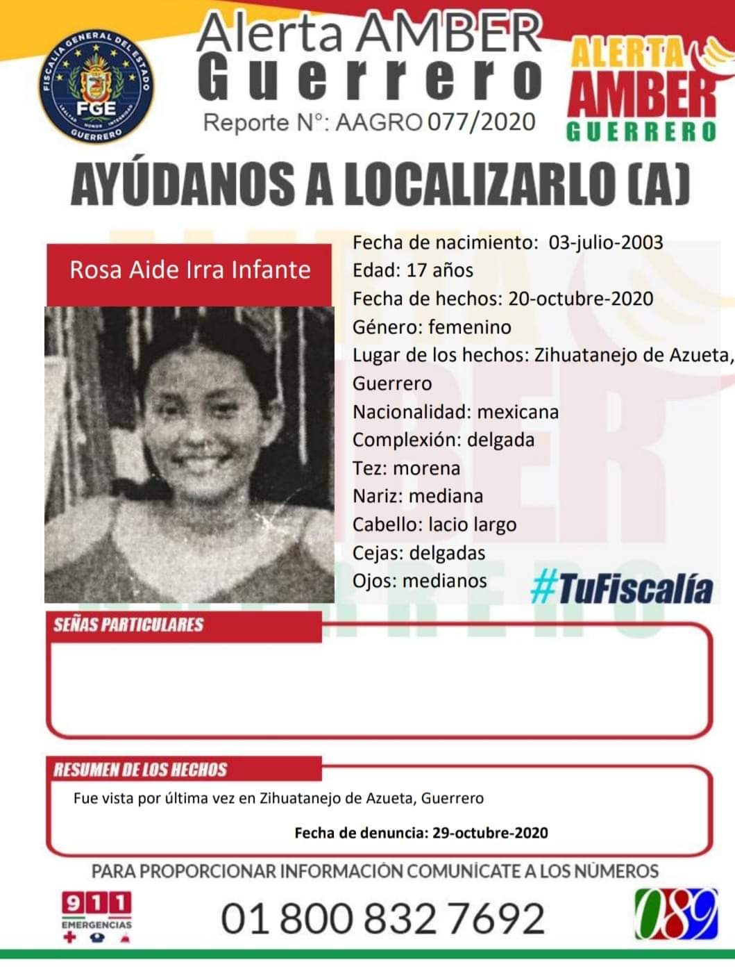 Chilpancingo, Gro.  04 de noviembre 2020.-  En lo que va de este 2020 en Guerrero se registraron 97 personas desaparecidas, entre menores de la edad, adolescentes, jóvenes y mujeres mayores de edad; de los cuales 45 siguen desaparecidos de acuerdo con información de la Alerta Amber y Protocolo Alba Guerrero.