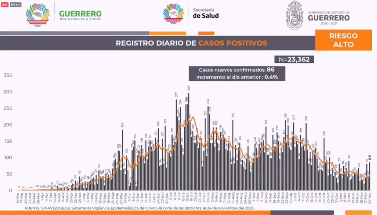 Chilpancingo, Gro., 23 de noviembre de 2020.- Luego de mantener una tendencia a la baja por más de una semana en el número de nuevos contagios por Covid-19, en las últimas 24 horas se registraron 86 nuevos casos, sólo por debajo de la cifra registrada el 09 de noviembre con 90 casos.