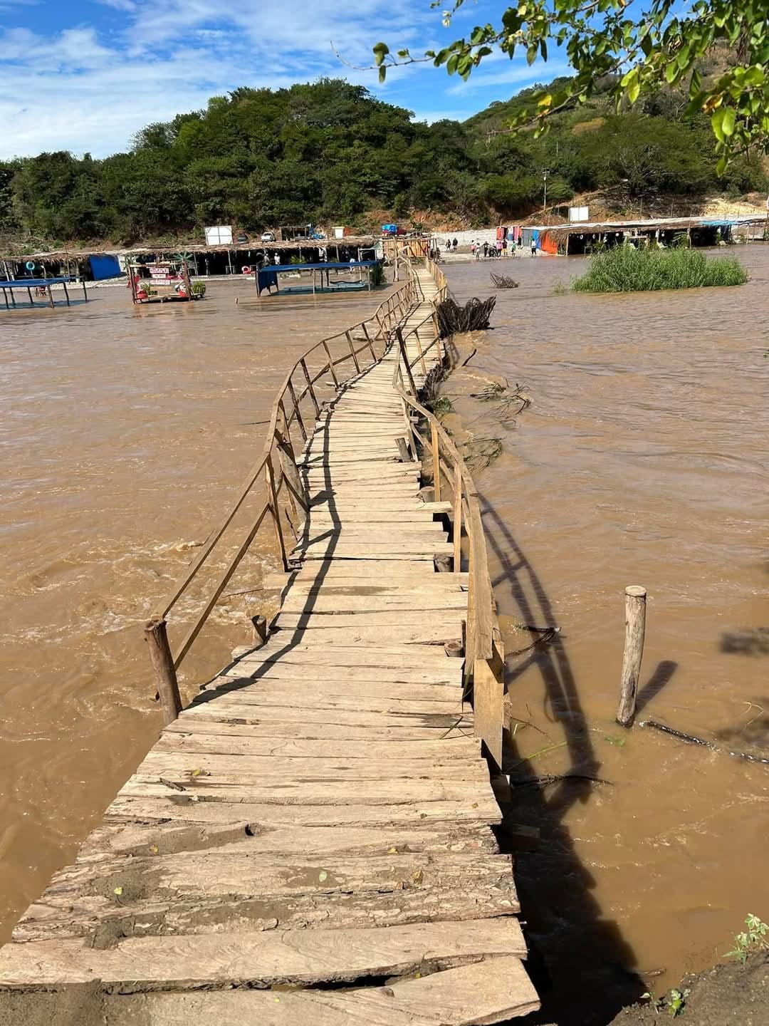En la zona de enramadas, los pobladores construyeron un puente de madera para comunicar los dos extremos del río, dado que la comunidad está dividida en dos zonas.