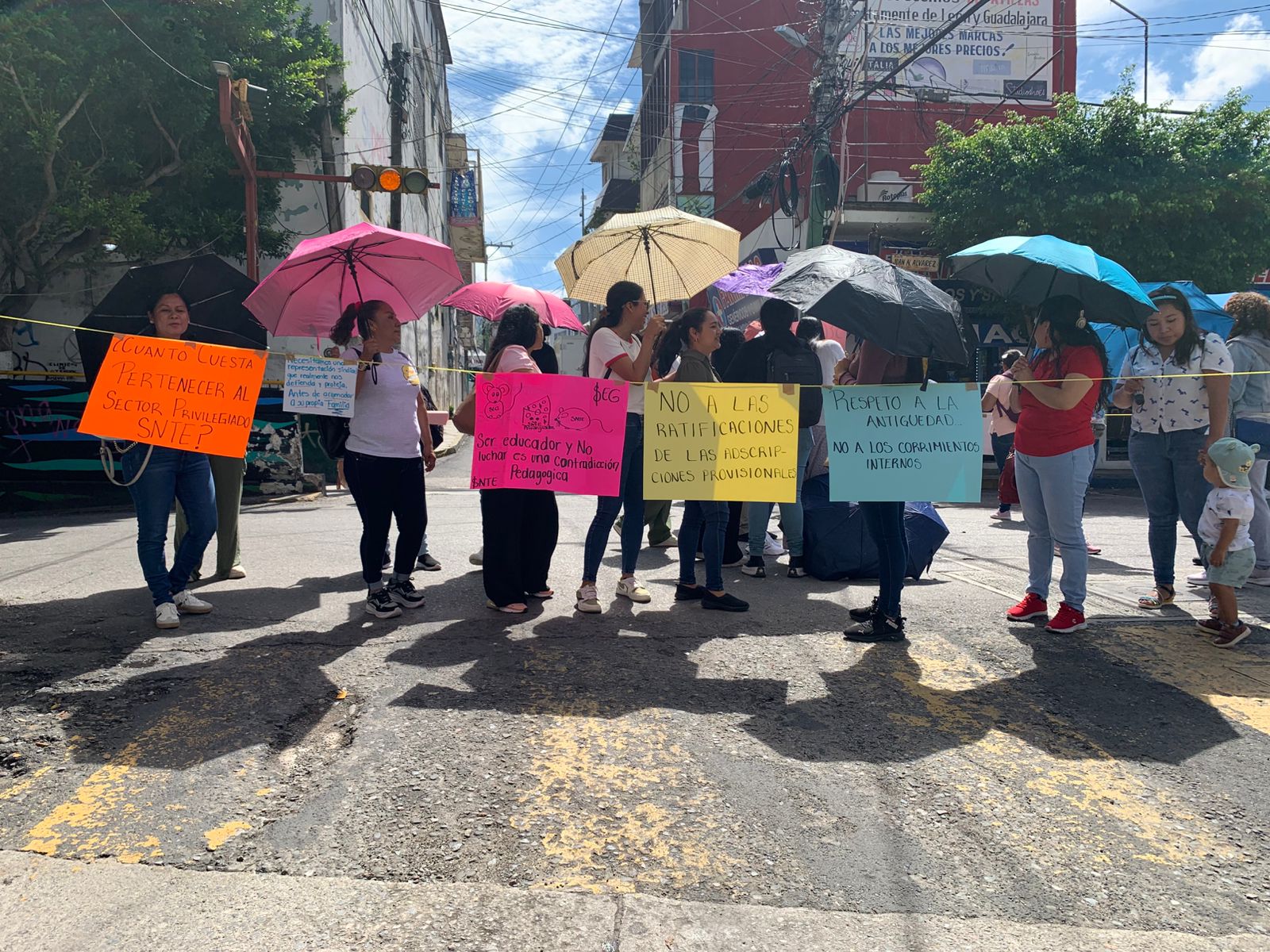 Alrededor de las 10 de la mañana un grupo de unas 30 docentes, se concentraron sobre la avenida Juan N. Álvarez y el calle Cristóbal Colón, antes del paso desnivel y con cuerdas y pancartas bloquearon la vialidad.