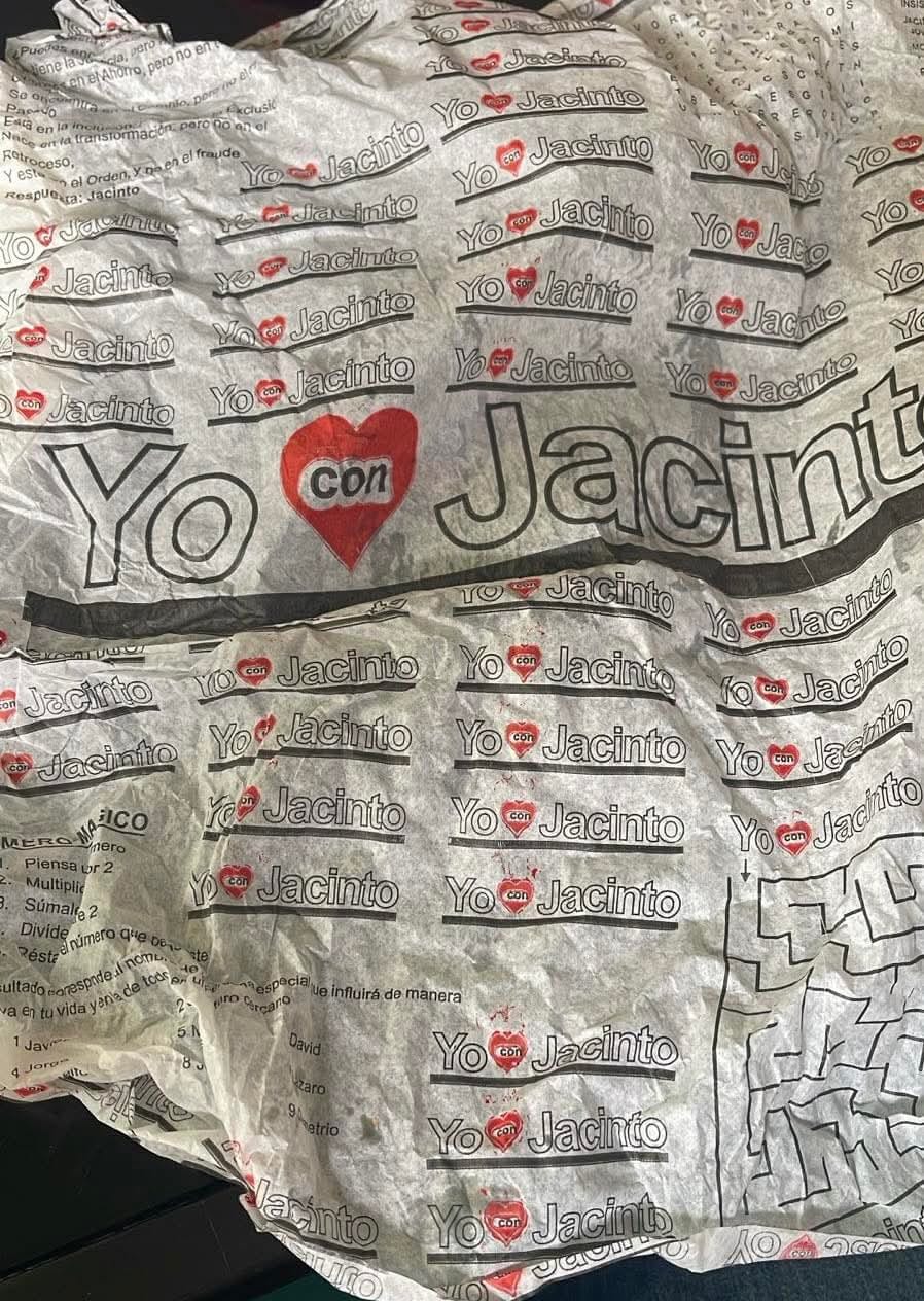 En esta ocasión la denuncia de la existencia y distribución de esos papeles para envolver tortillas la hizo el integrante de la Comisión Operativa Estatal de Movimiento Ciudadano, Sergio Montes Carrillo. El exmilitante y consejero de Morena publicó en su perfil el papel que ahora están dando en algunas tortillerías, para sustituir el papel de estraza, es un papel blanco con letras en rojo “Yo (la figura de un corazón con la leyenda en medio de) con Jacinto”.