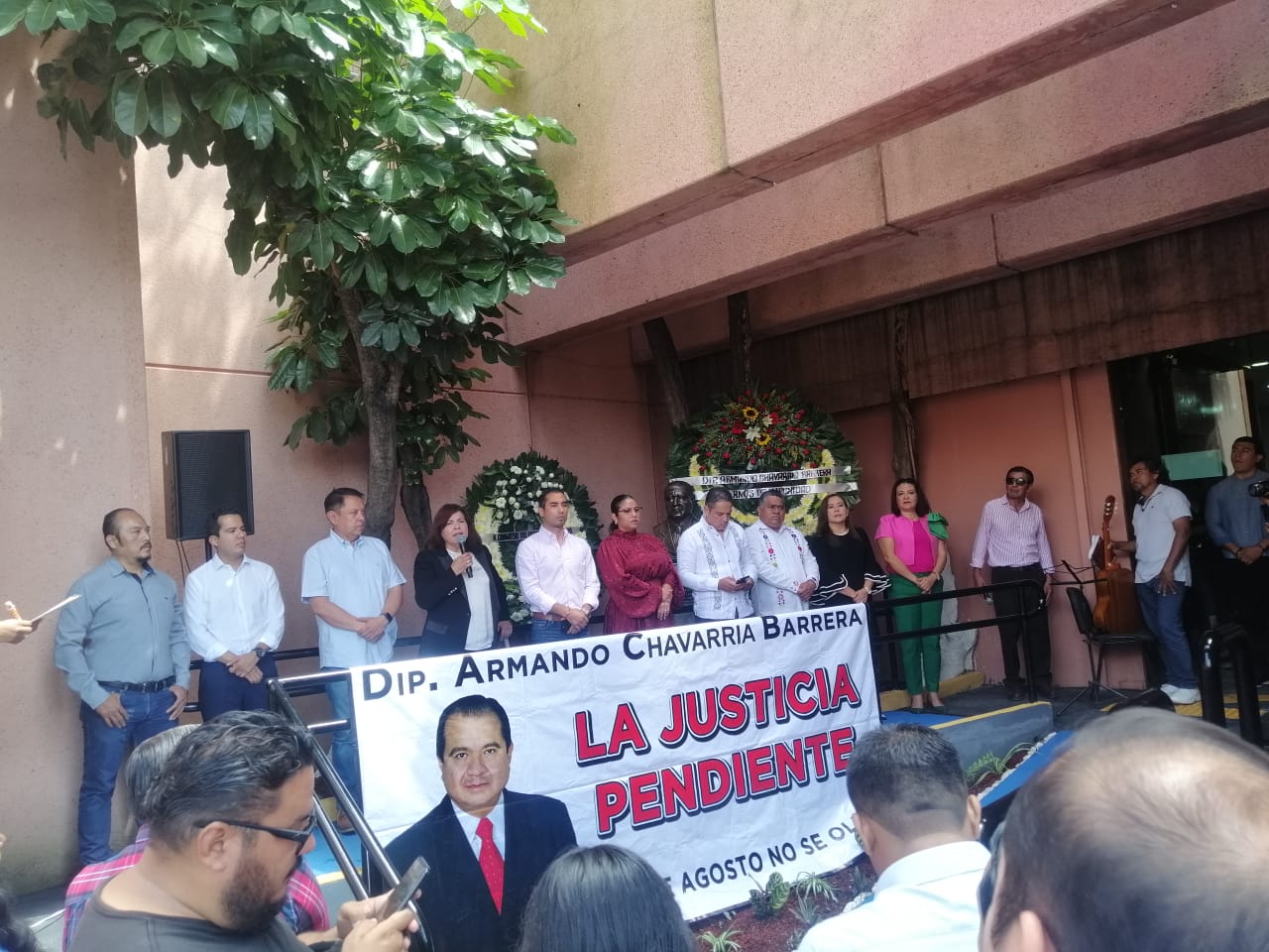 Chilpancingo, 20 de agosto de 2025.- Diputados locales, familiares y amigos de Armando Chavarría Barrera, asesinado hace 16 años, rindieron un homenaje en la entrada del Congreso en el que exigieron justicia y denunciaron que las redes de complicidad en el poder mantienen el caso en la impunidad.