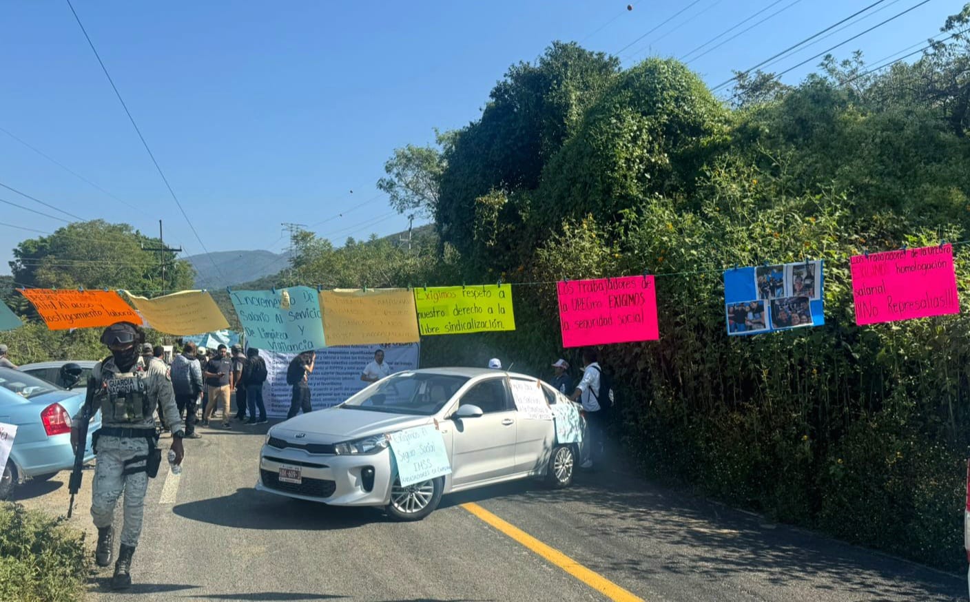 Chilpancingo, 28 de octubre de 2025.- Trabajadores de la Universidad Politécnica del Estado de Guerrero, con sede en la comunidad de Puente Campuzano, bloquearon la carretera Iguala-Taxco en exigencia de mejoras salariales.