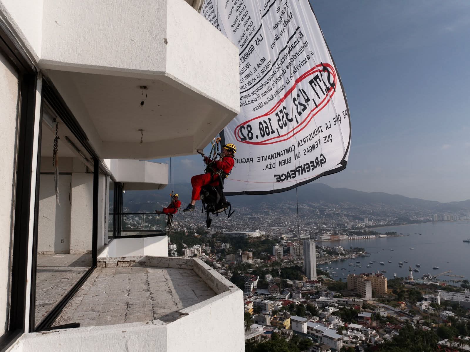 En un comunicado Greenpeace explicó que decidieron colocar ese enorme ticket en un edificio de Acapulco para señalar que en los últimos días años en México esos fenómenos han dejado daños por 177 mil 423 millones 355 mil 160 pesos que refleja “el costo de la crisis climática y la inacción política”.