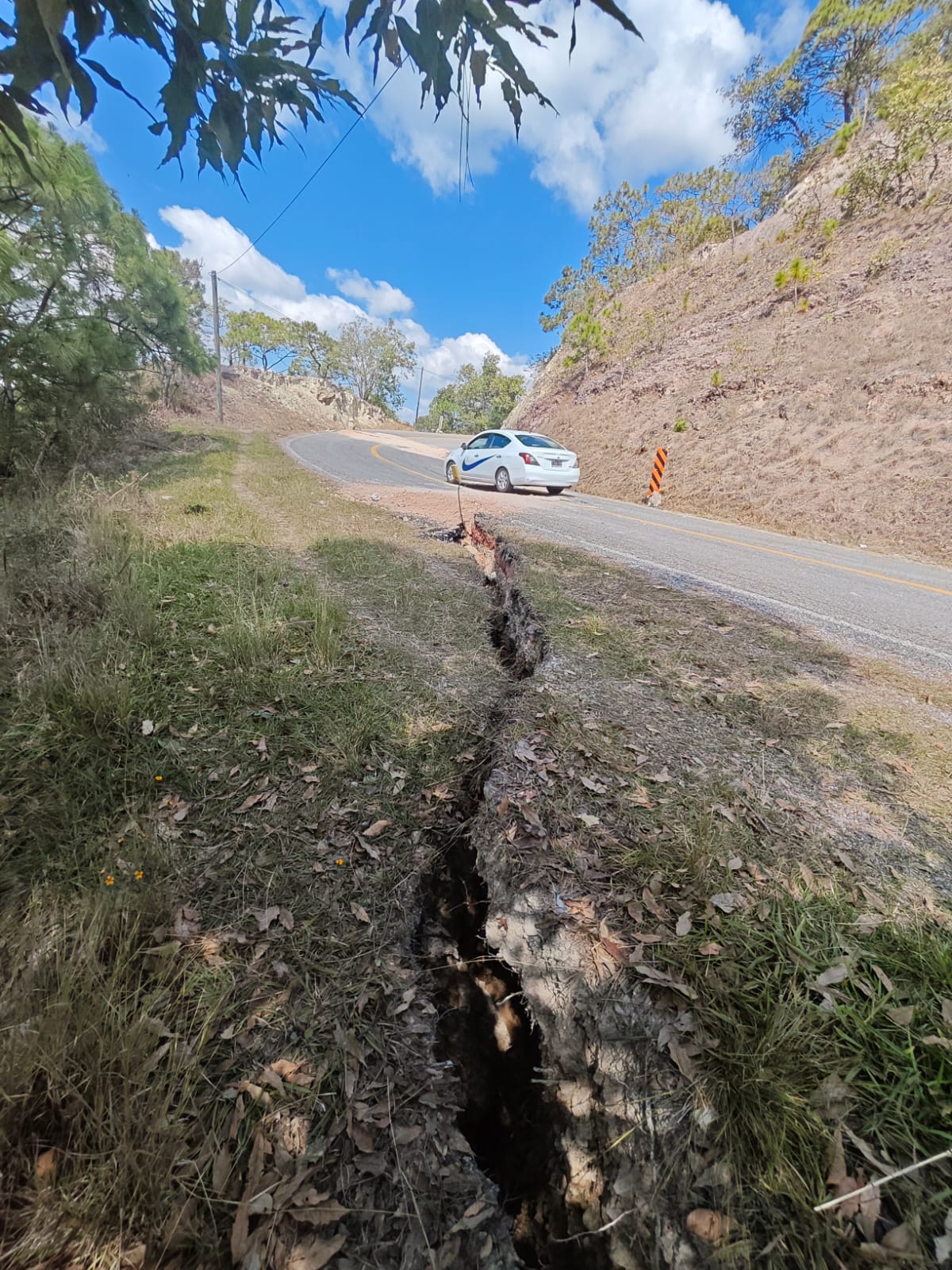 donde una grieta de unos 15 metros atraviesa los dos carriles de circulación y se aprecia que en cualquier momento la grita va a segmentar parte del cerro por el que pasa esta carretera. En el lugar personal de la Secretaría de Infraestructura Comunicaciones y Transportes (SICT) ha colocado señalamientos preventivos y un letrero de que se hacen “obras de reparación”, pero hasta este lunes solo han colocado revestimento carretero para evitar que no se suspenda la circulación vial.